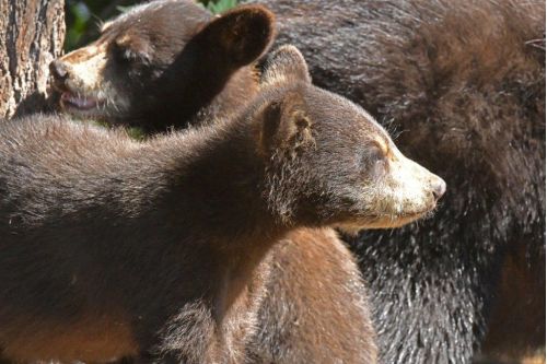 Cinnamon's cubsColleen and Cinnamon and their cubs also stopped by. Cinnamon is shedding and looking almost as black as Colleen where the new fur is coming in on her face and chest as in the picture. In the picture of Cinnamon’s cubs, the one in the foreground is the male.