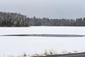 With the temperature in the 20’s, open water had shrunk to the small area in the picture—too small for a loon to take off. With their heavy bodies and small wings, they have to patter across the water farther than any water bird I know of to lift off. The open water is now too small.