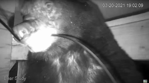 Spring officially started at 5:37 PM CDT, and that’s about the time that things started happening. Spanky finally decided to check out the microphone and then the camera as we watched worried that he’d go too far and destroy it. He mouthed the camera, tilted it down, and bit wires, making us worry about him getting a shock. We checked with Mauro. The camera is very low voltage and wouldn’t hurt him. Spanky then took a spring walk that has lasted over 3 hours. Spanky showed us the ultimate closeup as we held our breaths about what he was going to do to the camera. Here is a 5 minute video showing Spanky looking for trouble: https://youtu.be/k_491dLMxV0