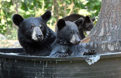 On this 91° day, little Lincoln joined his mother Chloe in the tub for some water fun. With their ears in the ‘airplane’ play position they splashed around with looks of enjoyment on their faces. They paused a moment to watch a passing bear and then were back at it. Finally, Lincoln shook the water off so vigorously that his ears flopped in strange positions. Sibling Charlie Brown joined them briefly but didn’t get in the tub.