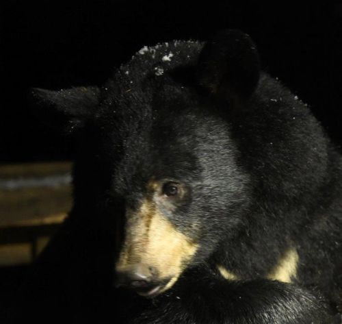 Visiting young male bearFalling snow and temperatures in the low 30’s did not deter two adolescent males who are the only bears still putting in appearances here. We seldom see bears in November but remember the glaring exception of Quill, the lone cub whose last appearance was at 12:07 AM on November 18, 2016. The bears today remained for about an hour and moved on. We’ll see how long that continues.