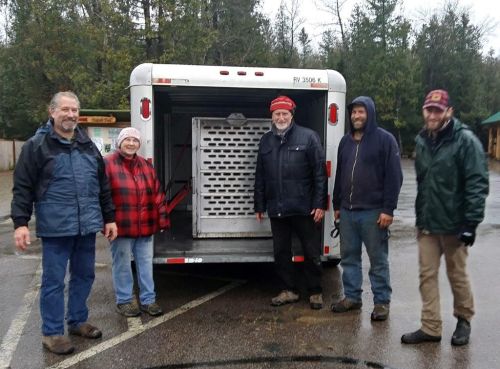 Then, from behind us, we heard, “Now get out of the way.” Sharon and I moved to each side as the team set the cage tight against the front of Ted’s chalet. Ted calmly stood up, looked at the inside of the cage, and unexplainably walked into it. The team lowered the sliding door.