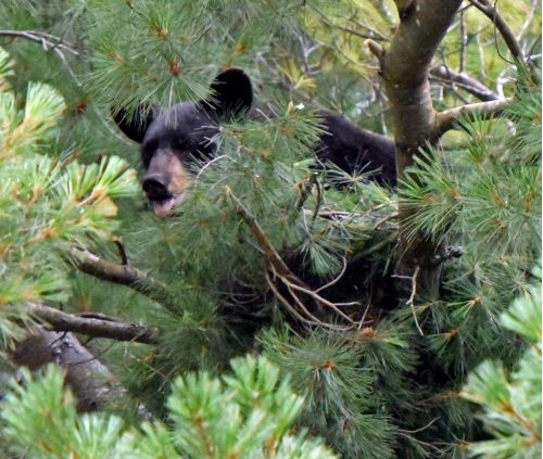 Another instance of nest-building was on August 8, 2017, when we watched a young male black bear move to the outer reaches of a white pine branch and create a semblance of a nest by breaking and arranging small branches that he rested on for a few hours until the sun’s rays hit him directly and he moved to the shaded heart of the crown, never to use the nest again. The picture shows the ends of a couple broken branches during construction.