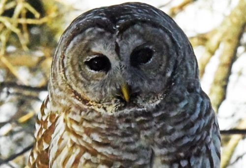 Barred OwlWith the temperature at minus 17°F, I was pleasantly surprised to see the barred owl again looking at me sitting at my desk. I aimed the camera that is almost always ready and saw that the picture captured the frost near its beak and rimming its eyes on its eyelids.