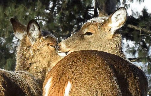 One deer was reaching up to nibble tiny catkins from a shrub. Another was standing in the sun using its tongue to groom the fur on its flank and then to get hard-frozen snow off its foot. A mother who looks pregnant with a litter already 4 months along nuzzled the 9-month-old fawn she will stay with until the litter comes due at the end of May.