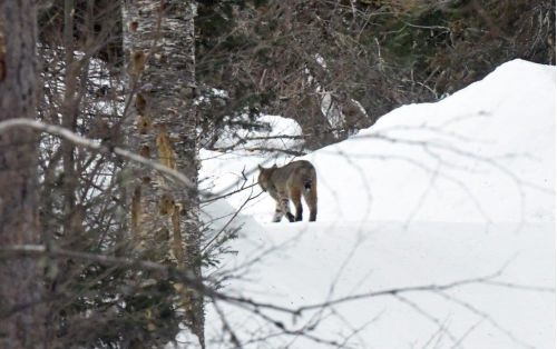 BobcatAll was normal. The nice fox has been taking her treats overnight unseen. The deer are coming with their big pleading eyes. The usual birds, including over a hundred redpolls, are flicking in as usual. And then Donna, down in the living room, saw the deer bolt with the bobcat spicing things up just outside the window. She yelled for me, and I hurried down not knowing I needed the camera. The bobcat was walking away up the driveway. I hurried, but by the time I could click the bobcat was over 200 feet away rounding the bend. That was the biggest excitement of the day. I wish Pretty Girl would come and top it, but I suspect I’ll just find her drumstick and mini-muffins gone in the morning, if she dares to come at all where the bobcat has been.