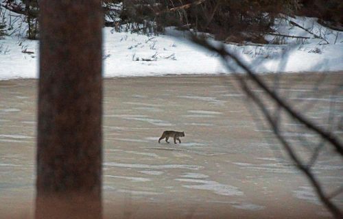 Bobcat crossing the frozen lakeAt 7:15 AM, I was surprised to see "Bob Cat" the bobcat crossing Woods Lake on the ice that is discoloring as the snow and some of the ice begins to melt. I don’t know much about where he goes when he is not showing up on the camera here as he did again a couple days ago. Nice to see him, but could he be the reason Pretty Girl didn’t come for her supper last night?