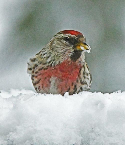 Only a couple inches were added to the existing snow, judging from how much new snow is under the redpoll on the railing outside my desk window.