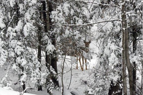 Eastern ChipmunkToday started with a snowstorm that made everything look like winter, including this deer (above) peering through snow-covered branches. As the day progressed, the first chipmunk, an Eastern chipmunk, was out running through the fresh snow. By the end of the day, most of the new snow had melted, uncovering little green sprouts of grass being nibbled by a new woodchuck. This is not the woodchuck we saw a few days ago with a bit of its ear gone. With two woodchucks living here, chances are good we can watch young woodchucks grow up here this summer.
