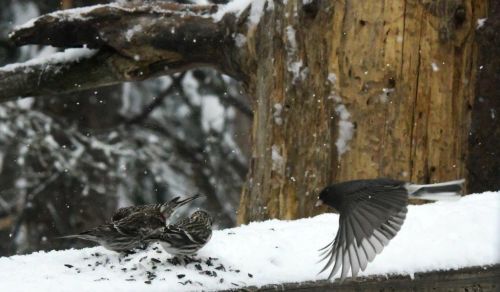At the WRI, dark-eyed juncos are migrating through, giving me a chance to see how they are accepted (or not) by redpolls that are busy ingesting sunflower seed hearts. Will the redpolls accept juncos like a flock of them accepted a purple finch that squeezed in shoulder to shoulder among them? Today, a junco landed several inches away from these three redpolls that included an adult male. A burst of three clicks within a single second caught the action as the male redpoll made a fast turn with beak open,