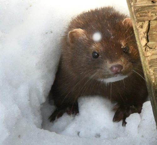 Yesterday at the WRI, the mink let me see that it is the one named Spot who visited a lot in February and March over a year ago. Yesterday, I saw it out the window but it disappeared by the time I got out on the second floor deck with bologna. Thinking the mink had gone, I noisily shoveled away some of the ice. Then, in a hole in a mound of crusted snow just four feet away, the mink appeared. Soon I discovered that he or she has a labyrinth of interconnected burrows under the snow mound that stretches the 40-foot length of the deck with many exits. It felt good to see how calmly the mink came out and walked toward me as I offered bologna. It was definitely one that knows us here. It did not come close enough to take a piece from my hand, though, so I threw small pieces here and there trying to land them in places where it would lift its head and show the pattern of white on the chin and neck. Eventually, it paused and raised its head before coming out of an entrance, finally revealing that it is Spot. I haven’t seen him or her today yet, and it is after 8 PM. I don’t know its habits yet and when to expect it. I’m hoping for more visits.