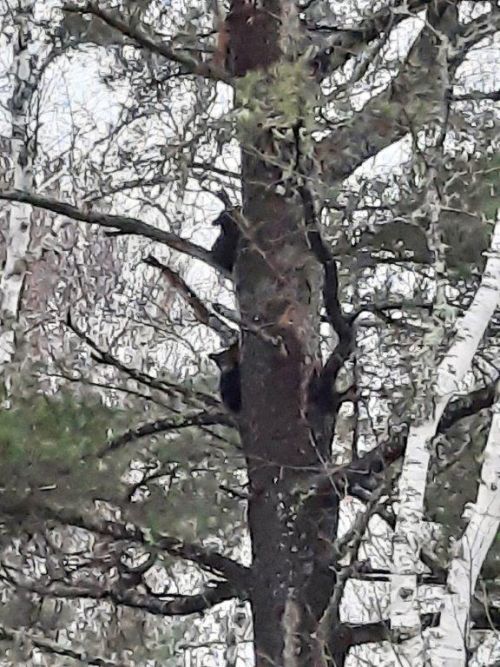 Carolyn's two cubsMay first, May Day, is also known as Workers’ Day and it looks like Carolyn bear has some work cut out for her. She is the first mother with cubs I’ve heard of around here this year. The picture I was emailed shows the cubs in a white pine looking healthy. We don’t know the sexes yet, but things are getting exciting. Five-year-old Carolyn is Shadow’s great granddaughter. This is her second litter. The lineage is Shadow, Blackheart, Donna, and Carolyn—plus cubs. Everyone is keeping an eye out to see where they go next, what sexes they are, any markings, etc.