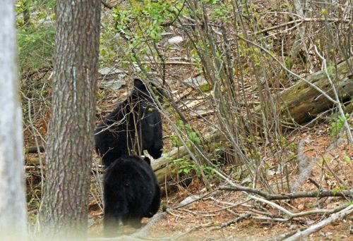 Lucy w/ a yearlingLucy was here today with sweet Desi and Arnie. Lucy weighed 157 now at 6 years of age. She has always been a bit small and didn’t have cubs until she was five. Great to see her—the same old Lucy. Calm as can be. Desi, too. Arnie is a bit skittish. Personalities vary. She and her yearlings were here for about an hour and a half but Lucy had things on her mind and didn’t eat much. She was roaming the area sniffing trees and the ground. I was wondering if she was just catching up on who had been here or if she is approaching estrus and sniffing for males. By the time I thought to snap pictures, she and the yearlings were on their way out making the only photo proof of their visit what you see. She left grunting to her yearlings as usual, but break-up can happen suddenly. I hope they come back enough to know when it happens.