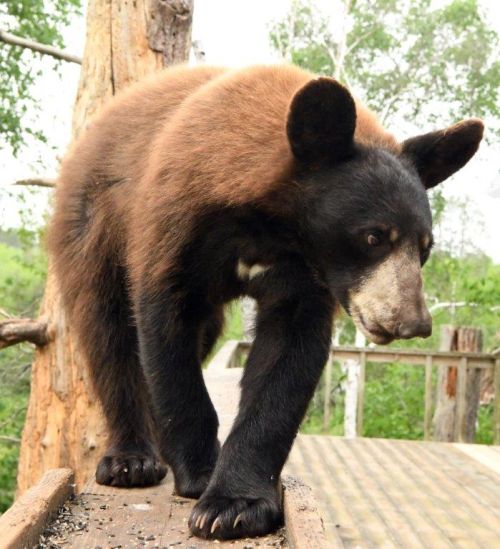 I first saw Spanky on May 2 when he weighed 278 pounds. On May 5 or 6, Spanky maybe got hit by a car or something. His right front leg dangled with no control. It swiveled like it was not connected at the shoulder. I could only believe he would lose it. The last time I saw him, on May 18, his leg still looked hopeless. Somehow, he made it to a favorite haunt some 4 miles away. A week ago word came that he was putting some weight on it. Today, he showed up back here. I thought I recognized him, but this bear was walking almost normal. It couldn’t be. He saw a bear to chase away (either 2-year-old Flynn or 4-year-old Chloe) and went after it on the run! (Photo) Amazing. It was Spanky. He is going to be okay. Now at 261 pounds, he’ll probably want to eat extra. The nice portrait of him by Mark Peterson shows the face that makes everyone want to help him.