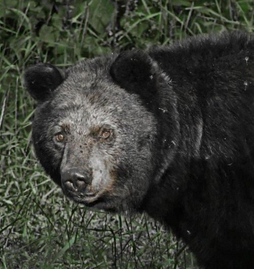 Yesterday at dawn, I saw a bear in the distance with a light face and an odd movement of its left hind leg. Shadow? Was it really her face and gait? Then near sundown I saw a similarly light face but with the setting sun lighting it too brightly. I wasn’t sure. In photoshop, I removed some of the glare. Shadow! I compared her face with a picture from a couple years ago. No doubt! Plus, she showed her skittish personality. She has had more time than any bear in this area to lose her anxiety and build trust, but she can’t seem to do that. Cautious as usual, she eyed me from a distance and disappeared into the woods. It wasn’t a location and situation she had learned to semi-trust.