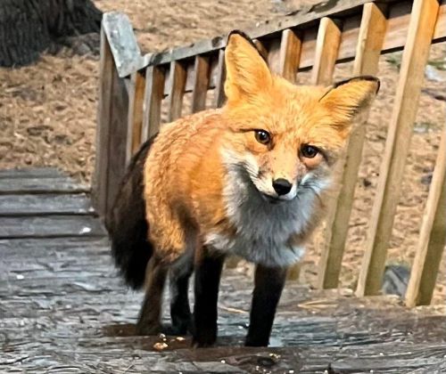 Deer in colorful, snowy drivewayColor, snow decorating branches, and deer hesitated to leave the driveway knowing that snow would fall on them from every branch they touched. In the snow I saw tracks of an animal I haven’t seen for many months. Then, a member of Team Forward here to work as usual, clicked the perfect picture of him with her cell phone—a beautiful red fox. Winter seems a little brighter with the possibility of a fox to spice things up in the absence of bears.
