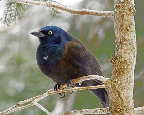 The lone grackle, recognizable by the distinctive white spot on her breast, sat looking extra pretty in the light, still apparently doing okay on her own although she is much less aggressive in grabbing peanuts than the blue jays.