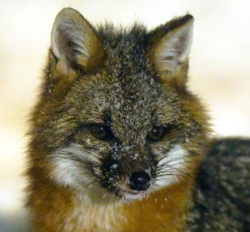 Heading home last night, I took one more look into the darkness for any movement. Just 10 feet away, the gray fox had his head deep in a hole that he was vigorously digging in the snow. Every few seconds he paused to look around, scanning every direction except toward the cabin before becoming vulnerable halfway into the hole. He hadn’t noticed me in the window. I wondered if I had time to go upstairs and grab the camera. When I got back downstairs, he was still at work. I quietly braced the camera against the window for an ID shot, but it was too dark for the camera to focus. Then he looked directly at me, perfectly still. There was enough detail in his face for the camera to focus, and he was still enough for a sharp picture despite the slow shutter speed, and the camera brightened it enough to be better than expected.
