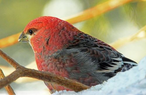 Pine grosbeak femaleToday, I got excited when two pine grosbeaks calmly continued to eat just outside my desk window as they watched me grab my camera and snap their pictures, but then I learned that pine grosbeaks are one of the birds that will actually eat sitting on people’s hands like many other northern forest birds will do.