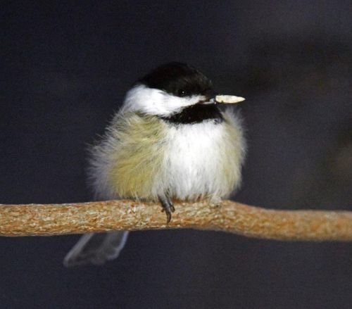 This morning was not as cold as it has been, but at 14°F below zero at 7:28 AM this first bird of the day said it was cold enough to feel it. It grabbed a sunflower seed heart, but instead of holding it firmly between its two feet to peck pieces from it, the chickadee just sat quietly letting only one foot contact the cold branch. The other was pulled up in its feathers that were fluffed to the max for insulation. It makes a person wish he could do something, but somehow the birds survive and keep coming all winter. Although, I do wonder what happened to the lone grackle that came all the time until the cold spell.
