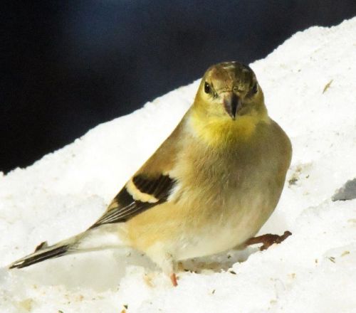 A flock of 25 goldfinches flew in for the sunflower seed hearts, and one of them posed nicely on top of a snow mound to show its winter plumage, which I appreciated. I wish Bob Cat would come back. I have the lights out inside and the camera aimed, but I guess it will be awhile, and I have to go home where the grandkids are making things about as wild as Bob Cat.