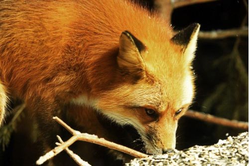 At 7 PM, what I have been looking for out the window for weeks was there—a big animal that was not scared. The fox looked at me and came up to the feeding spot outside my window like I wasn’t there. It sniffed for meat that wasn’t out yet. (click). Then I saw that it was the limping male red fox, and it was hardly limping. Good to see. I got up and went to the door. The fox came to the door and watched as I grabbed the only food handy—a package of four blueberry mini-muffins. He watched me open it. I opened the door, and he did no more than move back about four feet to watch as I tossed them into the snow. Without hesitation, he came toward me and took one down the stairs. A couple minutes later he confidently ran back up the stairs to grab two more of them and head up the driveway. We put out a couple freshly warmed pork chops cut into quarters, but it is now 40 minutes later and he is not back yet. I want him to feel thoroughly treated so he comes back a lot. Maybe he’ll be back during the night and be caught on the security camera. Whatever he does, he made my day.