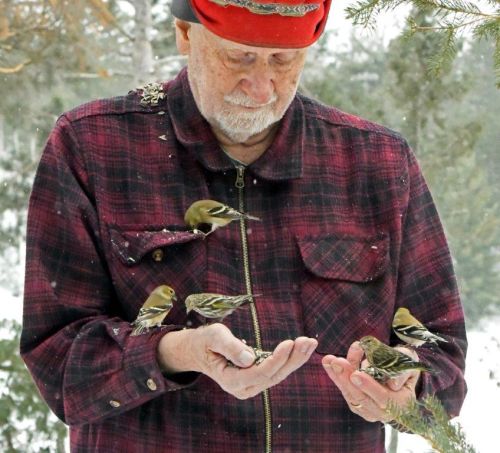 Dr. Rogers with pine siskinsChickadees were the first on the scene. Eight of them gathered on branches within about three feet of me but none were accustomed to me. Within ten minutes, though, three of them dared to quickly and cautiously snatch seeds from my hand and fly off to peck them into little pieces. Three red-breasted nuthatches came close but weren’t quite brave enough.