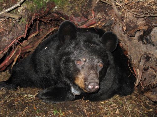 Catching up with my old junior college friend Tom Dygert on the phone a few days ago, he told me of an exciting bear experience he had in Michigan’s Upper Peninsula back on November 14, 1977. Exploring the woods near the town of Marinisco, he saw what might be an old bear den. Crawling in several feet to see what it’s like in a bear den, he paused to let his eyes dilate in the darkness. When he could see, he was one inch from the bear’s nose and backed out pronto. I was amazed to hear his story, having seen a lot of bears more expressive than that. But each bear has its own personality, and I have a nice memory of nearly the same thing happening to me on March 14, 1986. It was a 21-year-old mother with three cubs. I was with my USFS boss and was trying to not do anything that would seem unsafe. It was a surface bed—not much of a den. She seemed lethargic. It was windy. I knelt down, put my camera up to my face and wondered what was wrong. It wouldn’t focus and was just black. I pushed the button a couple times but still the same. I took the camera down from my face to see what was wrong and found we were nearly nose-to-nose. With the wind, I hadn’t heard her lunge three feet to my face. What I was seeing was her black fur too close to be in focus. I quickly moved back and was amazed she had done nothing as we were suddenly face to face with me backing away like Tom did. But it gave me a good feeling to see this bear show once again that black bears are far more likely to show restraint than ferocity. It was doubly amazing to me that she was not more defensive considering that she was so wary that she evaded my barrel traps for four years before I finally caught and radio-collared her. Then she went on to become the oldest bear of that long-term study, making it to 29¾ before being shot by a hunter in 1994. She had her last cub, a single (just like Shadow’s last cub Spanky was a single) at the age of 26 in 1991.
