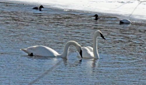 Today spring sprang here beautifully with the temperature in the high 40’s F, no wind, and a blue sky. It was time for Donna and my spring tradition of seeing the Trumpeter Swans that have returned to an open stretch on the Shagawa River just east of Ely. About a dozen swans were back, mostly pairs, with a dozen or so Goldeneye Ducks sharing the water. The nearest pair of swans looked serene with no hint what would come next, something I never saw before, and now I know why. It only happened for about a minute. But a lot happened in that time. Suddenly, the male, the swan on the right in the serene picture, was on his mate, taking the back of her head in his bill with both of their heads submerged for a few seconds. Then their heads were up where they could breathe again as they went from one position to another, ending with what looked like a celebration of both their heads extended tall together. A lucky sighting.