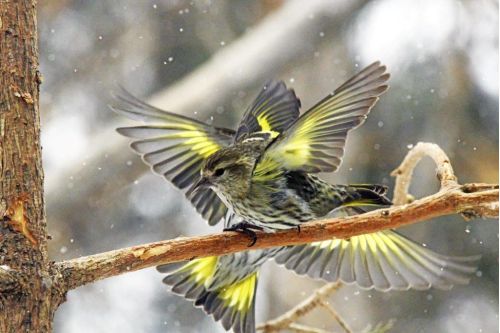 Pine siskinA male pine siskin that was drab in one picture was part of a double splash of color a tiny fraction of a second later when it shared the limelight with another flashing male for an instant. You never know what you’re going to get.