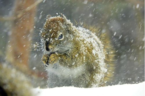Herring gullThey are less trusting than siskins but are still quicker to trust than most other birds. I stood still as a siskin hopped closer on a branch, but it wouldn’t come all the way, flew to a farther branch, came back, and finally said okay. Kind of. It landed on my hand and flew back to the branch without taking a seed. It did that several times. Then another one landed and took a seed and kept eating. The first one then dared, also. Then there were three and five and suddenly the memorable moment when the whole flock was landing all over me. Seventeen was my highest count with a whir of feathers in my ears and countable siskins on my arms, shoulders, head, and a metal scoop of sunflower seed hearts under my right arm. They completely ignored me and competed for space at the seeds. They proved their point to me. They were so hungry they would throw caution to the wind and focus entirely on the food. They were hungry, and I knew what I had to do. I moved to the railing. Some flew off as I moved, but others remained on me. From the scoop I put a long pile on the railing, more on the roof of the little feeder, and more elsewhere so they could spread out and fill up before the blizzard covered the seeds. The wind was strong enough that it actually kept the snow from building up on a couple spots. The goldfinches joined them. Chickadees squeezed in where they could. All was good with a few moments so good I wished someone was here to snap a picture for posterity. The snowy squirrel was the only picture.
