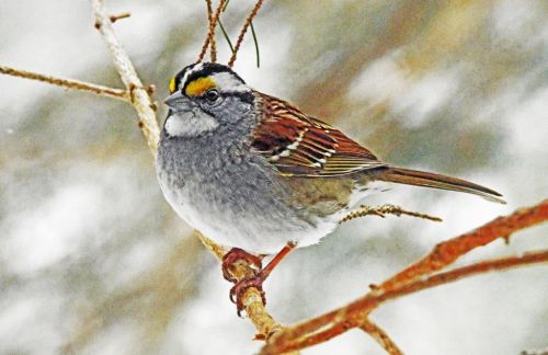 With 8-10 inches of new snow to melt, I’m missing the bears. I know of six being seen some 2½ miles away but none right around here. Here it’s foxes and raccoons, plus red squirrels and birds. With the birds it’s exciting to get first-of-the-year views, like the white-throated sparrow that was visible for only a moment but long enough to let me see its white throat and pretty face.