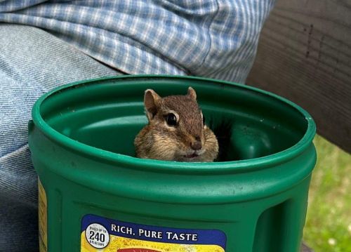 In this course, this chipmunk distracted some from their interactions with bears. People were picking him up, stroking his back, and seeing him fearlessly continue his quest to fill his cheeks. In the process, he climbed pant legs, checked shoulders, went across the back of people’s necks, or just explored across their laps. He fearlessly gets into the confines of a container that says “Rich Pure Taste” even though there are people nearby who have gently touched him or stroked him as he kept stuffing his cheeks. He hasn’t bitten anyone. Watching his (or her) quick dashes away to its hole to empty its cheeks and return in a minute or three, we got into counting how many hazelnuts he’d take at a time—typically 6 to 11, usually 7-9.
