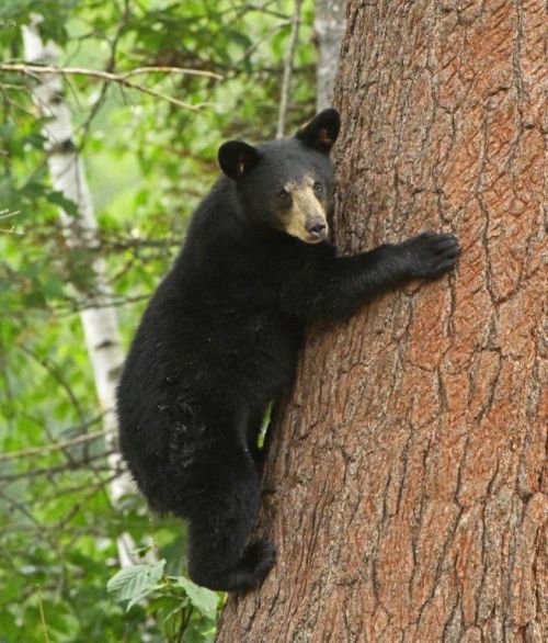 Seeing 7-year-old Lucy (Shadow, Blackheart, Braveheart, Samantha, Lucy) and her three female cubs is a joy each day. Mike and Lorie named the cubs Leilani, Lilo, and Lea, matching name length to cub size large to small. The picture is of Lilo descending from a white pine looking concerned because she can’t see mom Lucy who she shortly found and accompanied.