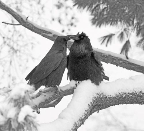 Another favorite moment was seeing ravens enjoying closeness as a pair. This was a pair in which the male has the usual black chest without the white spots the other male has. The picture shows him and his mate facing each other to gently touch beaks. He has his eyebrow feathers sharply raised which I think in this situation shows excitement as they gently interact.