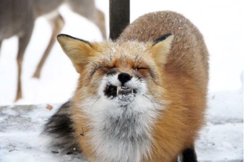 Red foxIt is nice to again be seeing the fox enjoy his mini-muffin treats. He eats other foods, too, and carries a lot of them far off to cache for another day, but muffins are the only thing that makes him tilt his nose up, close his eyes, and get lost in the enjoyment of chewing.