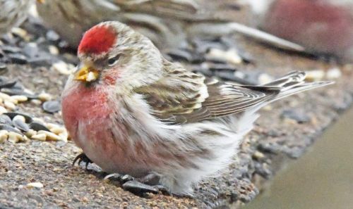 With the temperature this morning at 13 degrees and wind gusts up to 21 mph, a pretty male redpoll sat with its feathers fluffed for insulation even though redpolls live mainly up toward the Arctic Ocean. For a blue jay, the wind was pushing its crest high and making it flutter in the wind. Both birds were interested mainly in sunflower seeds that some nutritionists call a super food.