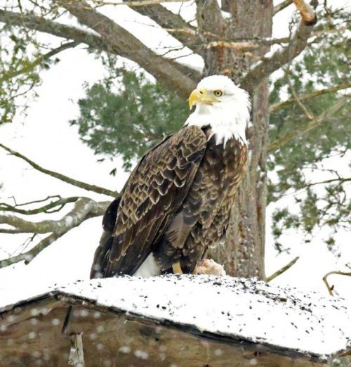 But it wasn’t on the moon. The eagle that has been swooping in over and over for quick airborne ‘grab and goes’ changed his tactics. On March 25 as Donna and I were unknowingly driving out the WRI driveway on our way to Duluth for my carotid surgery, the eagle settled down on its food spot outside the WRI window and efficiently ate ham fat for 40 minutes without having any of the meat slip away in flight or while he was eating it on a branch. Peggy Stubbs was "The Eyes of the Day" who captured the moment the eagle landed, stood regally looking at her in the window, and turned to his purpose of eating ham fat. I hope he keeps doing that.