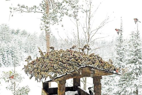 I have never seen so many birds here ever. The redpoll flock doubled again to more birds than I can count—guessing over 300. Too many to feed all in one feeding area, so all I could get in a picture was about 200 on this feeding spot with many waiting in trees and feeding in other areas. I don’t know if it’s the recent snow that made them come in such number. The flock of crows also grew too large to count easily but it is over 60.