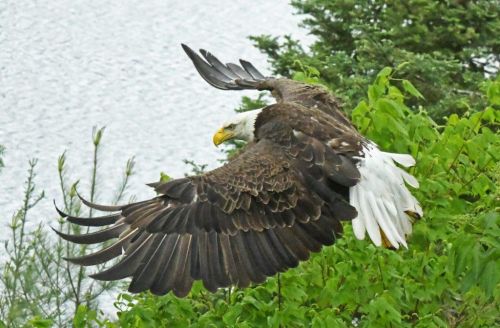 Before I could settle down, two adult eagles found the treat, undoubtedly the pair we were seeing a lot before the bears came. Do they fly over, high up and unnoticed able to look at the places we’ve left treats? The one flying in is the nearest one in the picture of them together. The farther one already has a piece of the meat in his or her beak. Seeing them like this is a treat for me.