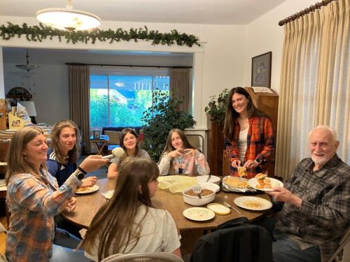The last few days have been a time of good feelings with family and see good feelings in bears. The story began when our daughters Colleen (on the left) and Kelly (on the right) came with the four fun grandkids making me have a good time being the old grandpa. Then a Lily Fan who is vacationing in the study area got wind of it and baked us all a beautiful big tasty peach pie. The picture is of the happy time of eating it a couple days ago that Donna captured with her cell phone.
