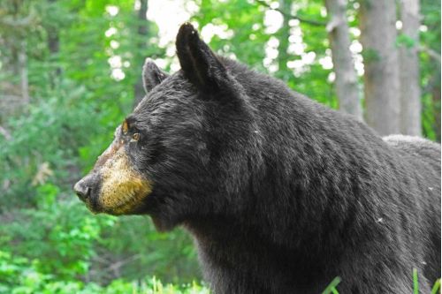 Ursulas male cubUrsula is giving us more opportunities to determine the sexes of her cubs, but the cubs are mostly behind the feeder or up a tree only half seen. But then, in a sighting this morning, one of her cubs was good to stand up next to a tree and say he is a male. Two to go. We don’t see Ursula a lot, probably because she likely lives ten or so miles west of here. But the food scarcity so far this summer has brought her in more often than in previous years. However, now, hazelnuts, pin cherries, and raspberries look like they are in the works, which may have her feeding closer to her home territory. I hope we can get the sexes for the record before she doesn’t feel the need to travel so far for a meal.