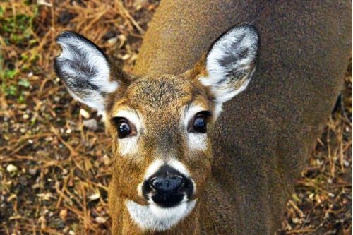 Late this afternoon, I saw my favorite deer—a doe named Notch (see the notch on her right ear) who is the most trusting. She was her usual self and looked straight up at me with her pretty face and irresistible eyes and got her reward of a scoop of sunflower seed hearts. She seems to know she has me trained.