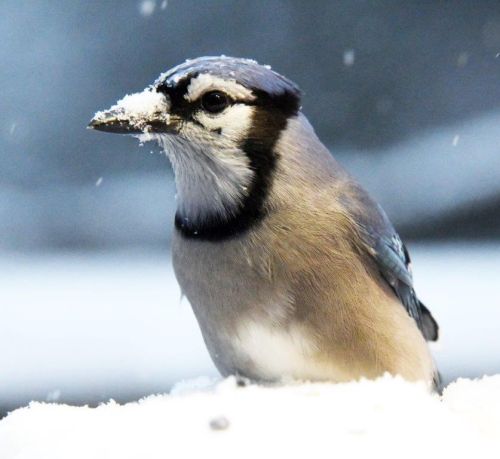 Fourteen blue jays are the main color in the new world of white where red squirrels take shelter under their tails.