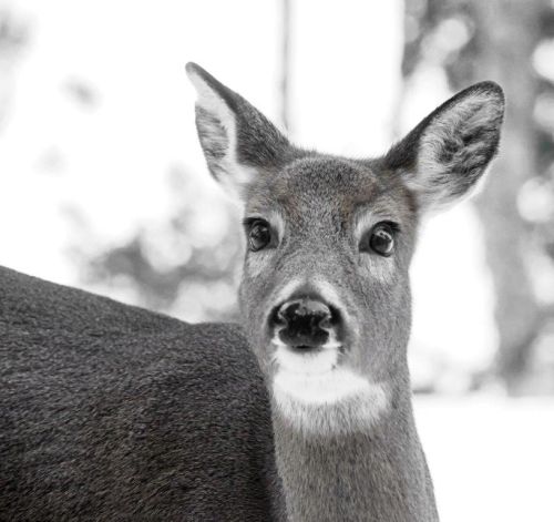 Notch, the tamest deer here, knows how to start a day demonstrating her trust. I drove in, saw her in the middle of the yard. She showed she knew what she had trained me to do. As I was getting out of the truck, she walked to her usual feeding spot at the front corner of the cabin and calmly watched as I parked, walked to the front deck and in the door. I did what I was supposed to. I went upstairs, got a scoop of raw peanuts without shells, carried it to the edge of the upper deck and saw her standing calmly as I towered over her some 10 feet above her. She didn’t flinch when I poured the peanuts down and she began eating. I went downstairs with my camera to get pictures of her face on her level. I braced the lens against the living room picture window ten feet from her as she just kept eating. I made strange noises to get her to look at the camera, but when she lifted her head she was looking other directions. Finally, when I was being quiet, she gave me the look in the picture, showing her big round eyes that probably give a big field of vision as a prey animal. Thank you, Notch. I’ll do the same for you every time.