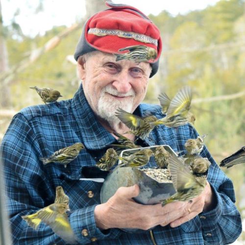 A couple days ago Donna took a picture of me being ignored while the siskins focused on the food as long as I made no fast moves. It was an enjoyable time. Also, they seem to know that someone who comes out that door is bearing food and they start dropping from the tall trees to nearby branches and the rooftop and even flocking to the deck and other areas that have food. Walking slowly back inside I can step just inches from those on the deck with some flying and others ignoring my proximity. They gave me a whole new view of them. They fly quickly if a squirrel moves quickly, if a blue jay sails in, or if the eagle, a raven, a crow, or a hawk comes through. If a squirrel just stays in one place eating the seeds, the siskins gradually move in within inches.