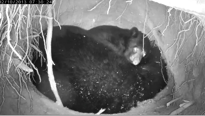 Jewel's cub wakes up - Feb 10, 2013It showed how alert black bears can be in mid-winter. Part of that is because they were fat and healthy going into the den. Skinny bears have to drop into a deeper hibernation to conserve energy as we’ve mentioned in past updates. It also clearly demonstrated how impossible it is to sneak up on the den of a well-fed bear and observe normal behavior—and how fortunate we are to be able to do so via the Den Cam.