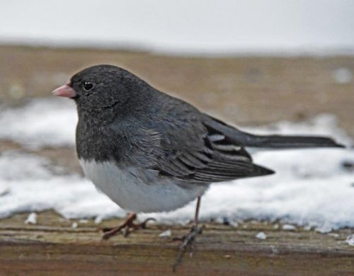 Out the window, dark-eyed juncos (Junco hyemalis) are coming through. We’re near the southern edge of their range. Old-timers called them slate-colored juncos. Another name is snow birds because they come through in fall about when the snow starts. In spring, it’s when the snow is about to melt. Once this cool spell (20’s F today) passes, we’ll have high temperatures in the 40’s to 60’s and the little bit of snow we have will disappear fast. We’ll be watching for early bears.