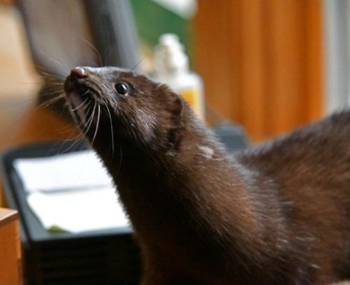 Mink Stripe with Donna RogersIt was great to see her after beginning to worry. Maybe the others will come back, too. The pictures show Stripe’s white chin with its dark stripes as she reacted to Donna holding a piece of bologna.