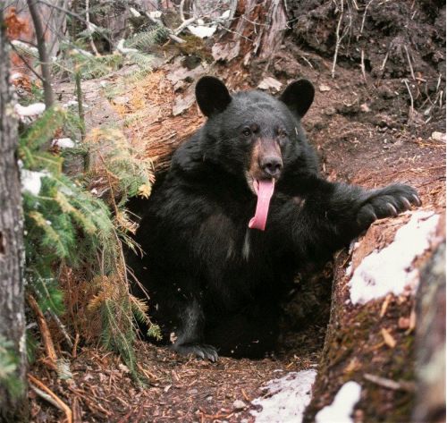 The bear in this picture is Dot, a bear that we followed from the time she and Donna were born to Blackheart in January 2000 until she was shot at 13 during hunting season on Friday the 13th of September, 2013. Her sibling Donna survives as a 21-year-old today. Dot was a sweetheart who will have a chapter in the book. This picture shows Dot in spring 2003 at the den where she produced her first litter. They were two females—Cinder, who had no black on her chest, and Trueheart, who had a white heart-shaped blaze. Many memories and stories. You may have seen Dot as a cub in Doug Hajicek’s Animal Planet documentary ‘The Man Who Walks With Bears’ (2001) and again as a mother at this den in a BBC program showing how a bear looks when infra-red light reveals the degree of heat loss from different parts of the body in winter. A portion of that program is now a video exhibit in the Hibernation Section of the North American Bear Center.